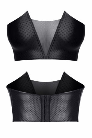 Gefertigt aus schwarzem, perforiertem Kunstleder, schmiegt sich das Top perfekt an die Konturen des Körpers an und betont jede Kurve. Für hohen Tragekomfort ist die Innenseite mit weichem Stoff überzogen und auf der Rückseite sorgt ein zweistufiger Metallhakenverschluss für optimale Anpassung.