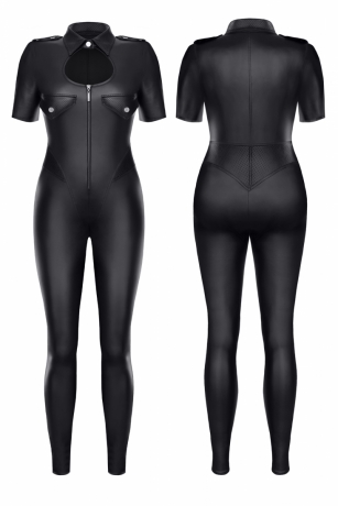 Fein abgestimmte Designdetails wie die aufgesetzten Brustaufnäher, die markanten Schulterklappen und der verstärkte Kragen verleihen dem Catsuit eine autoritäre, fast militärische Note – ein Look, der Macht und Erotik zugleich ausstrahlt. Der runde Brustausschnitt rahmt das Dekolleté verführerisch ein, während der vertikale Zierreißverschluss mit graviertem Demoniq-Logo als glänzender Blickfang fungiert.