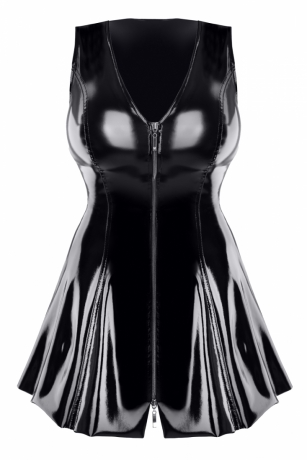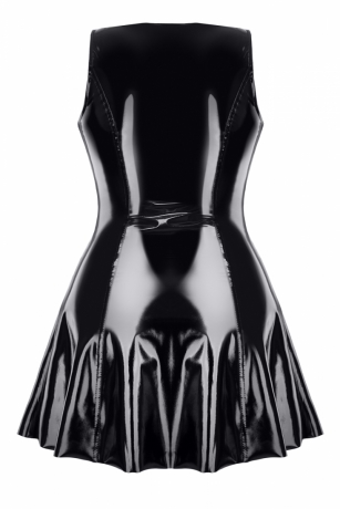 Dieses atemberaubende Kleid aus schwarzem, hochglänzendem PVC setzt jede Bewegung verführerisch in Szene. Die raffinierte, taillierte Schnittführung betont die Körpermitte perfekt und läuft nach unten in eine elegante Trapezformaus, die eine feminine Silhouette zaubert.