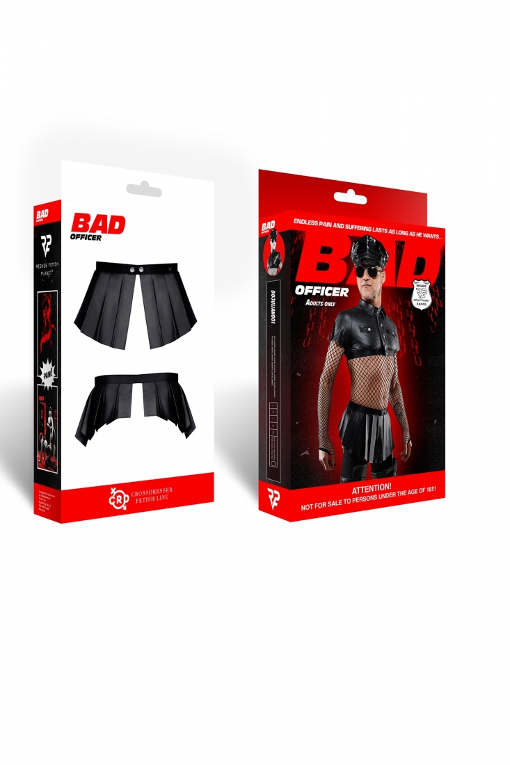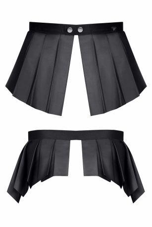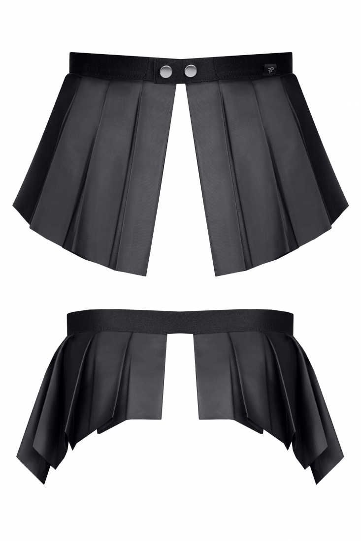 Dieser ultrakurze Rock aus plissiertem schwarzem Wetlook ist gemacht für freche Spiele und verführerische Auftritte. Vorne wird er durch zwei dekorative silberfarbene Druckknöpfe fixiert, während der hinten bewusst kürzere Schnitt die Rundungen des Pos verführerisch in Szene setzt – perfekt, um zu spielen, zu experimentieren oder einfach sinnlich zu verführen.